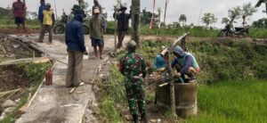 Sertu Joko Prasetyo bersama warga mengecek langsung kendala tersebut di lokasi pembangunan rabat beton yang menjadi salah satu sasaran fisik program TMMD.