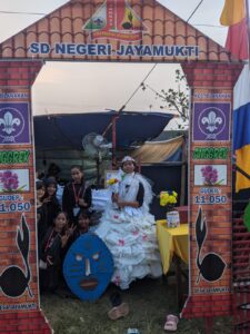 Selain karnaval, masing-masing sekolah juga mendirikan stand Gugus Depan dengan beragam hiasan kreatif. SDN Jayamukti (Gudep 11.050) menampilkan dekorasi unik dan karya seni siswa, termasuk kostum kreasi yang menarik perhatian pengunjung.