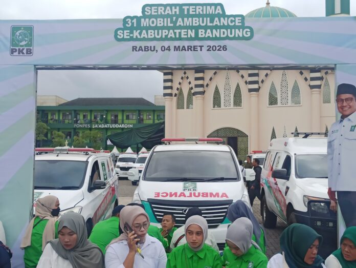 SerahTerima 31 Mobil Ambulance Se-Kabupaten Bandung Oleh Dr. HM Cucun Ahmad Syansurijal, M.Ap. Kepada Dr. H. Dadang Supriatna, S.Io. M. Si. Ketua DPC PKB Kabupaten Bandung, Untuk Pengurus Anak Cabang ( PAC ) PKB Di 31 Kecamatan Se-Kabupaten Bandung Pada Acara Silaturahmi Akbar PKB Kabupaten Bandung di Pondok Pesantren Sa’adatuddaroin Solokanjeruk Rabu 4 Maret 2026.