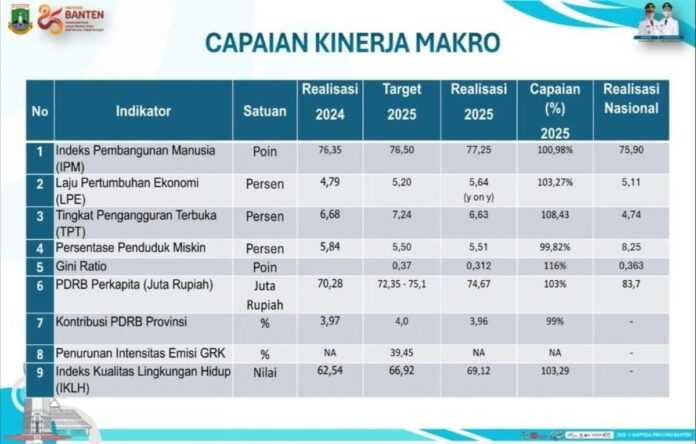Pada 2025, Provinsi Banten mencatat kinerja makro yang melampaui sejumlah target RPJMD. IPM mencapai 77,25 poin, melampaui target 76,50 dan menempatkan Banten di tujuh besar nasional kategori IPM tinggi.