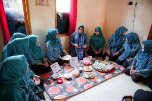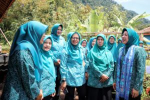 TP PKK Provinsi Banten meninjau Rumah Dilan di Desa Cikedung, tempat masyarakat lokal, termasuk lansia, mengembangkan produk kerajinan seperti bubu ikan, tampah, dan tas daur ulang.
