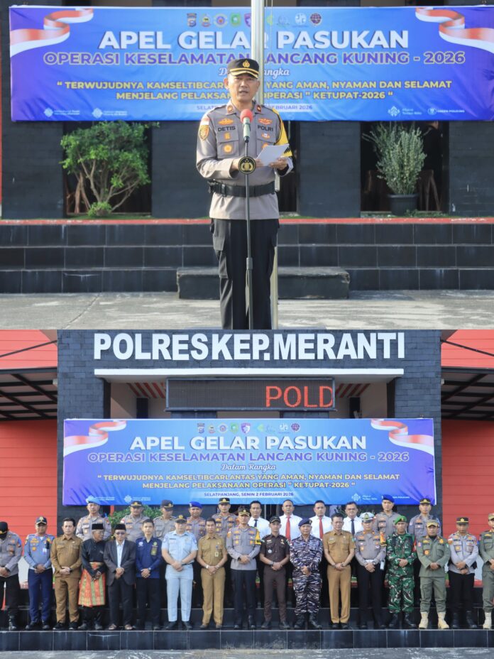 Meranti,- Polres Kepulauan Meranti menggelar Apel Gelar Pasukan Operasi Keselamatan Lancang Kuning 2026 sebagai bentuk kesiapan menghadapi pelaksanaan operasi kepolisian di bidang lalu lintas. Kegiatan ini dilaksanakan pada Senin (2/2/2026) sekitar pukul 07.30 WIB di Mako Polres Kepulauan Meranti, Jalan Gogok Darussalam, Kecamatan Tebing Tinggi Barat, Kabupaten Kepulauan Meranti.