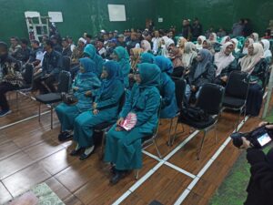 Nining Sarifah Susanto, Ketua TP-PKK Kecamatan Pacet, menyematkan Pin kepada Irma Novita Sari Ketua TP-PKK Desa Sukarame, disaksikan Ibu Kepala Desa Se-Kecamatan Pacet.